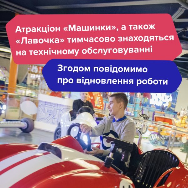 Атракціони Машинки та Лавочка знаходяться на технічному обслуговуванні. Про відновлення їх роботи повідомимо додатково.