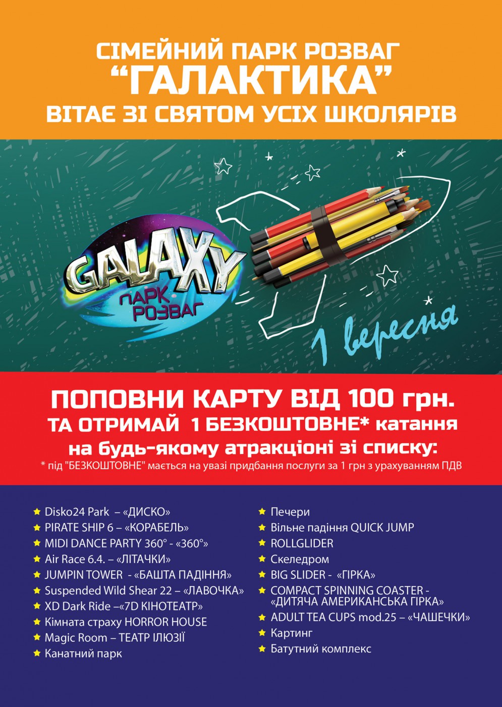 Найбільша цінність для команди сімейного парку розваг “Галактика” – безпека відвідувачів та їх гарний настрій. Усі наші атракціони — абсолютно нові, розроблені світовими флагманами ринку розваг, спроектовані на замовлення, змонтовані та протестовані з залученням висококласних фахівців з-за кордону та українських підрядників, а також обслуговуються і керуються спеціально підготовленими та навченими людьми — інструкторами, операторами, техніками.